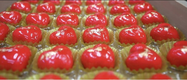 求肥餅でこし餡を包み食べ口はモチモチ食感にしてあります。1つずつ手でハート型を取り、真っ赤な光沢感を出すために赤色に着色した羊羹と寒天に砂糖を入れたツヤ天を二重にかけ、最後に金箔を降り、高級チョコレートをイメージした上品で可愛らしいハート型に仕上げました。