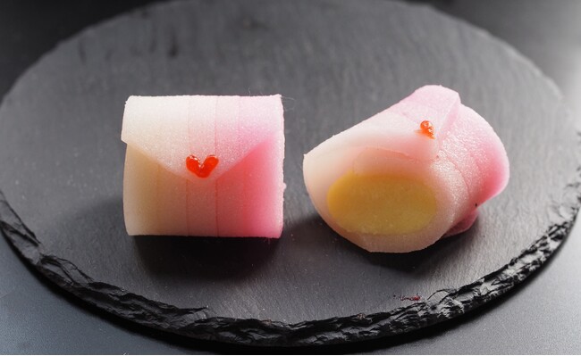 外側は、餅米を蒸して細かくしたものを寒天と砂糖を煮詰めたツヤ天の中に入れて、徐々に着色を濃くしながら流して、綺麗なグラデーションの上南羹にしました。中餡は自家製の柚子餡で、爽やかな柑橘の香りが口に広がります。手紙の形に端をカットし、最後の仕上げに赤羊かんで可愛らしいハートを描きました。