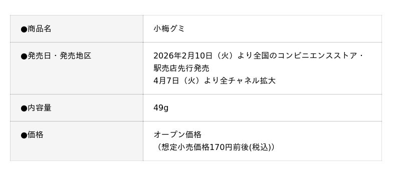 本品は、小梅ちゃんが慕う真(まこと)さんとの淡い恋のゆくえを予感させる春一番、そこにひらひらと舞う梅の花びら型をイメージしたあまずっぱい梅味のグミです。