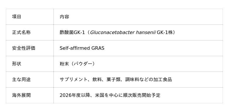 本ステータス確立により、「酢酸菌GK-1」は安全性と機能性を兼ね備えたグローバル素材として、米国市場への展開が可能となりました。これを受け、2026年度以降、健康志向の高い米国をはじめとした海外市場における原料販売の開始を目指します。