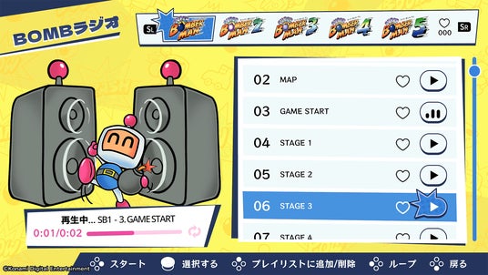 ・「スーパーボンバーマン」シリーズ5作品の楽曲を収録し、オリジナルのプレイリストも作れる