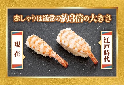江戸時代当時の「にぎり寿司」は、江戸前で獲れた魚貝を下処理したタネと、赤酢と塩で味付けしたすし飯が握られており、その大きさは現在の2倍から3倍も大きかったようです。当店では赤しゃりの味わいは現代の美味しさにアレンジしつつ、江戸時代のにぎり寿司の復刻として、「茹で天然車えび」を当時の大きさで再現しました。