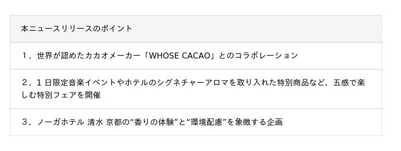 こうしたサステナビリティに親和性を持つ両者がコラボレーションする本フェアでは、ホテルのシグネチャーアロマにも使用している 「柚子」や「黒文字」の香りをWHOSE CACAO のクラフトチョコレートと融合させた、ノーガホテル京都でしか味わえない“オンリーワンのチョコレート体験” をご提供いたします。1 日限定の音楽イベントや、レストラン・ベーカリーでの期間限定メニューを通じて、世界が認めたカカオの奥行きと、和の香りが織りなす新たな味覚を五感でお楽しみください。