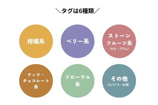 「柑橘系」「ベリー系」「ストーンフルーツ系(もも・プラム)」「ナッツ・チョコレート系」「フローラル系」「その他(スパイス・お酒)」