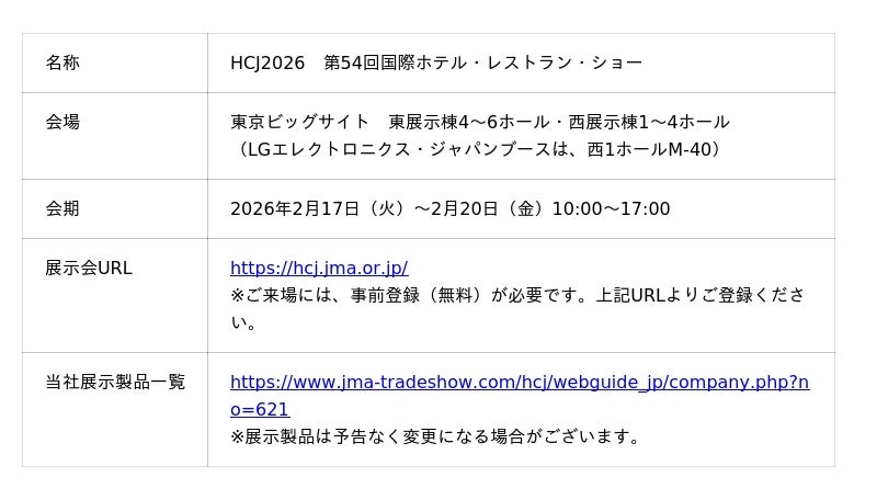 この機会にぜひ、LGエレクトロニクス・ジャパンが提案する新しいホスピタリティの形を、会場でご体験ください。皆さまのご来場を、心よりお待ちしております。