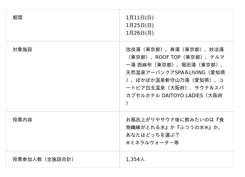 施設利用者に対し、その場で「お風呂上がり・サウナ後に飲みたいドリンク」として、「食物繊維がとれる水」と「ふつうの水※」のどちらを飲みたいかを選んでいただく形式で投票を行いました。