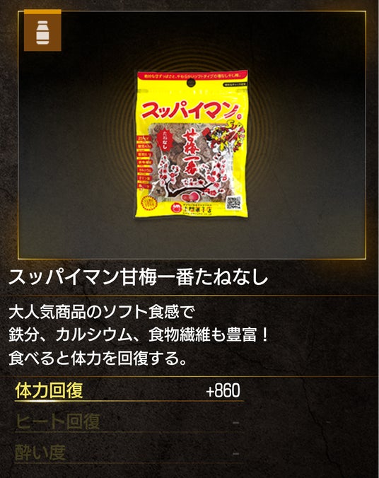 『龍が如く極3』では、物語の舞台となる沖縄の街並みを象徴する存在として、スッパイマンがゲーム内のさまざまな場所に登場。作中の「国際通り」にはスッパイマンの看板が登場し、プレイヤーが利用できる回復アイテムとしても「スッパイマンたねぬき梅キャンディー」や「スッパイマン柿ピー一番」など、当社の人気商品が多数ラインナップ。