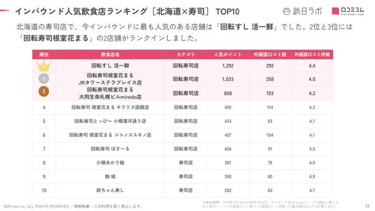 業界最大級のインバウンドビジネスメディア「訪日ラボ」及び 店舗向け集客一元化プラットフォーム「口コミコム」を運営する株式会社mov(代表取締役:渡邊 誠、本社:東京都渋谷区、以下mov)は、北海道の寿司店に寄せられた最新の口コミデータから、独自の『インバウンド人気飲食店ランキング』を発表しました。