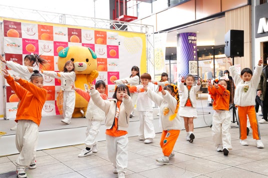 後半では、「えひめ愛フード推進機構」が かんきつの“旬”の時期分かりやすく覚えてもらうために制作した「愛媛のかんきつ 旬!旬!音頭」を、ディライブダンスカンパニーのスクール生がみきゃんと一緒に元気いっぱいに披露してくれました。