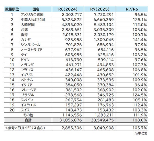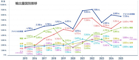 全国約1,600の酒類メーカー(日本酒、本格焼酎・泡盛、本みりん)が加盟する、日本酒業界最大の団体である日本酒造組合中央会(以下:中央会)は、2025年度(1月~12月)の日本酒輸出総額が約459億円(昨対比:約106%)、数量約3.35万?(昨対比:約108%)となったことを発表します(2025年財務省貿易統計)。