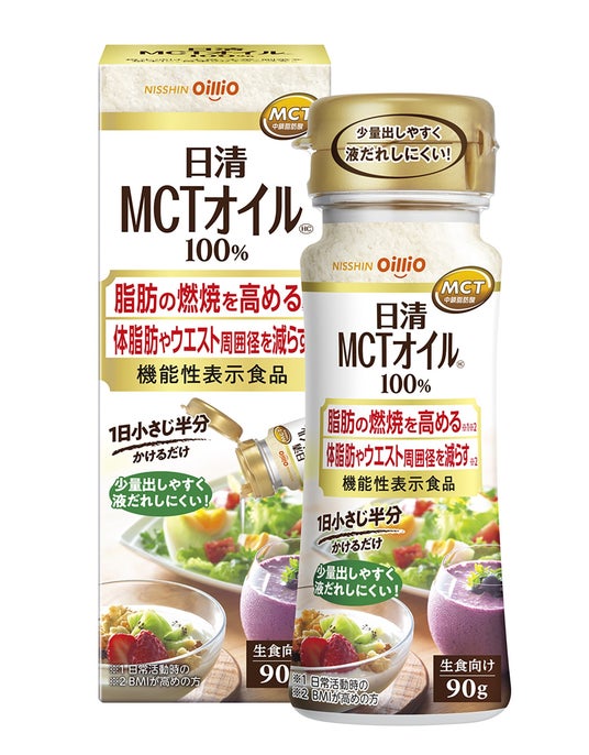 MCT(中鎖脂肪酸油)100%の食用油で、機能性表示食品(届出番号:I1338)です。中鎖脂肪酸(オクタン酸、デカン酸)はBMIが高めの方の日常活動時の脂肪の燃焼を高めること、ウエスト周囲径の減少、体脂肪や内臓脂肪を減らすことが報告されています。