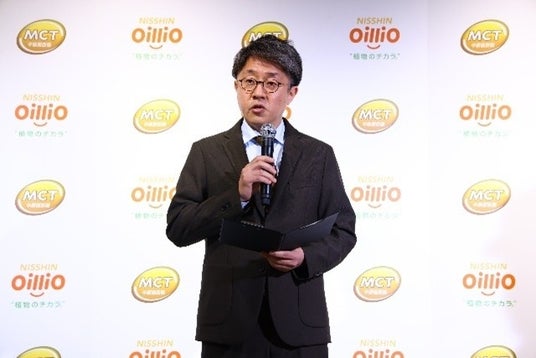商品紹介ゾーンを会場にして行われたお披露目会の冒頭では、日清オイリオグループ株式会社 食品事業本部 ウェルネス食品事業戦略部長 大塚竜太が「『日清MCTオイルHC』は、私たちの『次世代の柱』として、全社を挙げて注力している商品」「これまでの『健康意識が高い層』に加えて、『ゆるやかに健康を意識している層』へもその魅力をお伝えしていきたい」と商品について説明しました。また、なかやまきんに君さんをアンバサダーに起用した理由については、「なぜ、ストイックなきんに君さんが?と思われるかもしれないが、実はそこが狙い」「究極の体づくりを知り尽くしている彼だからこそ、精神論や根性だけでなく、エビデンスに基づいた素材として、長年『日清MCTオイルHC』を選び、愛用されている」と説明しました。