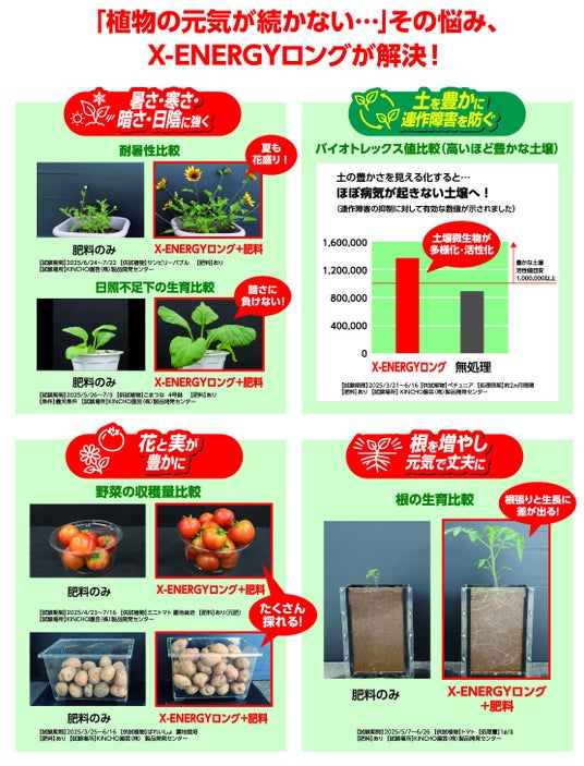 家庭園芸用薬品・肥料等を製造販売するKINCHO園芸株式会社(本社:東京都中央区/代表取締役社長: 森本 義之)は、植物を覚醒させるバイオスティミュラント活力液「X-ENERGY(エックスエナジー)」を2025年春から好評発売中。今回、新たに効果が続く「X-ENERGYロング 粒タイプ」および手軽に使える「X-ENERGYダイレクト アンプルタイプ」の2アイテムを2026年1月より追加発売いたしました。