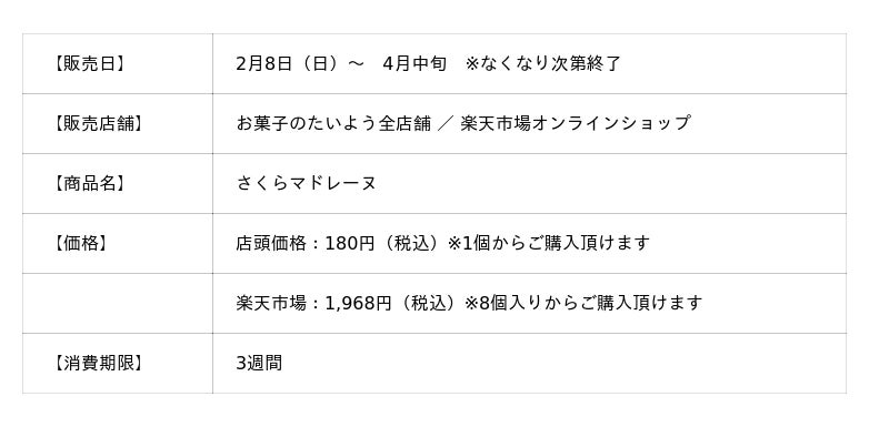 株式会社太陽社(所在地:千葉県匝瑳市飯倉293、代表取締役:片岡正裕)が展開する、千葉県で長年愛され続ける菓子店「お菓子のたいよう」は、桜スイーツ第1弾となる春限定商品「さくらマドレーヌ」を、2月8日(日)に発売いたします。