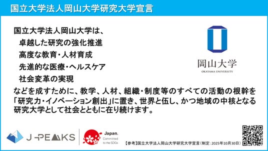 国立大学法人岡山大学(本部:岡山市北区、学長:那須保友)は2025年10月30日に「国立大学法人岡山大学研究大学宣言」を制定しました