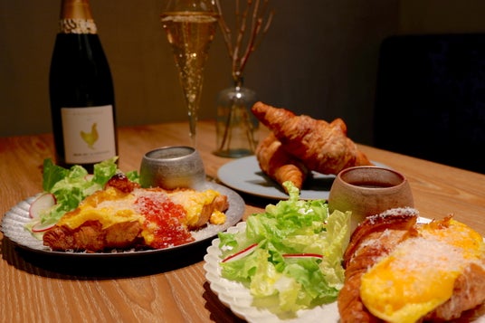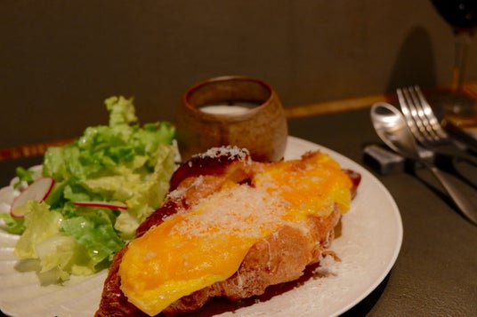 塩キャラメリゼクロワッサンの香ばしさが、卵のやさしい味わいを引き立て、ナイフとフォークで味わうことで、層ごとの食感と余韻を楽しめます。