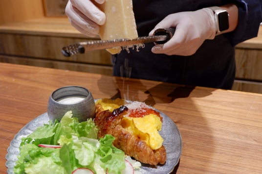 「Oeuf Truffe ―トリュフ香る とろける卵と香ばしチーズのクロワッサンサンドー」は、ボイルドエッグ、スクランブルエッグ、オムレツという三種の調理法で仕立てた卵を重ね、トリュフの香りと炙ったチーズのコクを添えた一皿です。