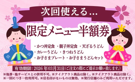 「限定メニュー半額お食事券」有効期限:2026年3月4日(水)~2026年3月31日(火)