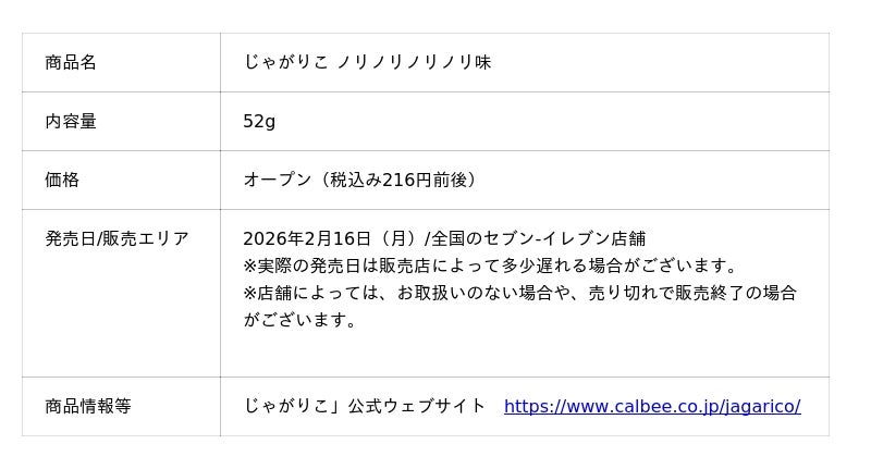 カルビー株式会社(本社:東京都千代田区、代表取締役社長兼CEO:江原 信)は、独自の製法で“はじめカリッとあとからサクサク”の心地よい食感が楽しめる「じゃがりこ」ブランドから、未だかつてない、ノリノリ♪のノリ味として『じゃがりこ ノリノリノリノリ味』を2026年2月16日(月)から全国のセブン-イレブン店舗で数量限定発売します。