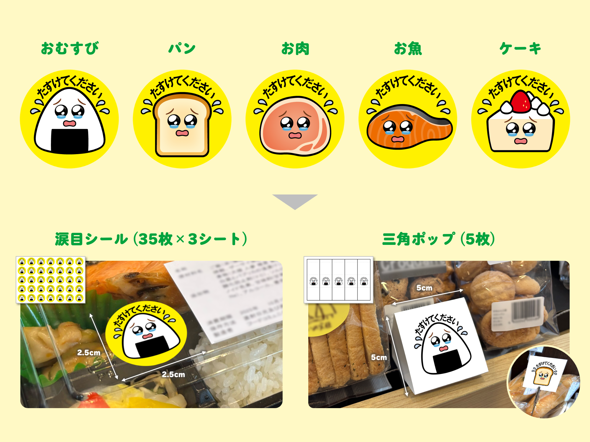 本キットでは、お好みのデザインと形状(涙目シールまたは三角ポップ)を選択でき、説明資料とともにお届けします。個人・法人を問わず応募可能で、自社での導入はもちろん、「このお店にあったら役立つのでは」と思う近隣店舗への配布など、使い方は自由です。