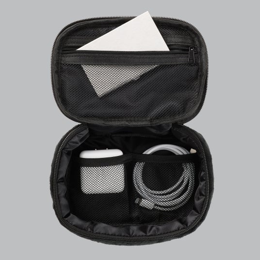 黒ねこマルチポーチは、マチが6cmと厚みがあり、収納力は抜群。180度大きく開く設計のため、中身をひと目で確認できます。チャック付きのメッシュ仕切りも備えており、充電ケーブルなどのガジェット類の収納はもちろん、文房具や旅行用のメイクポーチとしても活躍します。さらに、サイドにはケーブルを通せるケーブルポート付き。モバイルバッテリーを収納したままスマートフォンを充電でき、外出先でも便利にお使いいただけます。