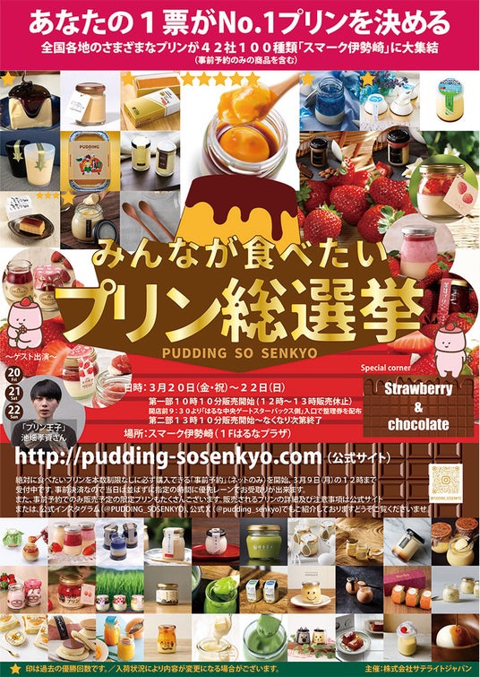 関西及び東海・関東地方中心にイベントの企画・運営を展開する株式会社サテライトジャパン(本社:兵庫県芦屋市)は、スマーク伊勢崎(運営:株式会社プライムプレイス)にて”北海道から九州まで全国各地のさまざまなプリンが大集結する”「第20回みんなが食べたいプリン総選挙」を2026年3月20日(金・祝)~22日(日)の3日間の日程で開催します。