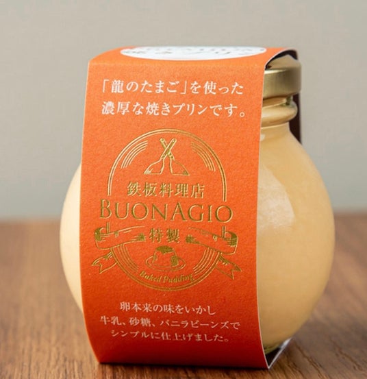【鉄板焼ブォナージョ】龍のたまごの手作りプリン(京都)京都河原町に店舗を構える鉄板焼で人気のブォナージョの〆の逸品として人気となり、お取り寄せ可能になりました。大分県のブランド卵<龍の卵>を使用。高い栄養価と濃い黄身のコクが味わえる「龍のたまごの手作りプリン」は、<2018接待の手土産入選>の秘書御用達の手土産として人気を誇ります。