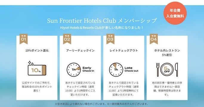 また、「サンフロンティアホテルズ」のオープンを機に、メンバーシッププログラム「HIYORI HOTELS & RESORTS Club」を「Sun Frontier Hotels Club」に改称し、引き続きお得な会員サービスをご提供いたします。