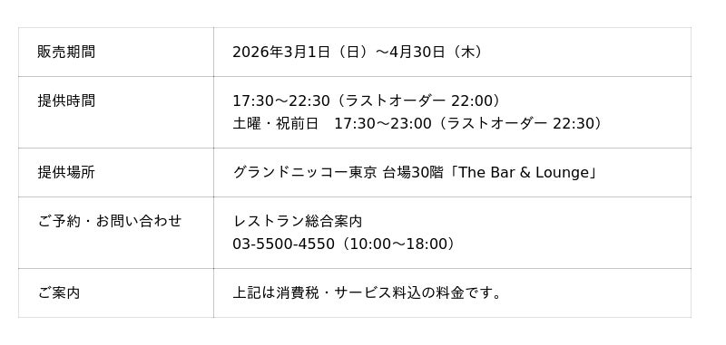 「東京を楽しむ 東京をくつろぐ」ひとときをお届けするグランドニッコー東京 台場(住所:東京都港区 総支配人:塚田 忠保)は、ホテル最上階から東京の夜景を一望できる「The Bar & Lounge」にて、抹茶の深みを堪能する『春の贅沢味覚パフェ』と、春を感じる『Spring Cocktail Selection』を、2026年3月1日(日)~4月30日(木)の期間限定で提供いたします。