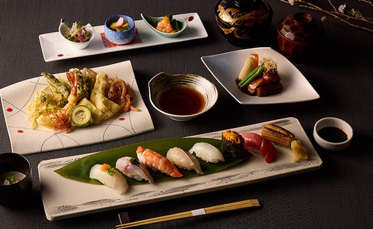 揚げたての天婦羅と端正な鮨を主軸にした会席をご用意いたしました。その日に仕入れた旬の魚介や瑞々しい野菜を使い、素材の風味を最大限に引き立てています。カウンターならではの醍醐味である「揚げたて」の天婦羅と、一貫ずつ丁寧に仕込まれた至福の寿司を、最上階の夜景とともに心ゆくまでお楽しみください。