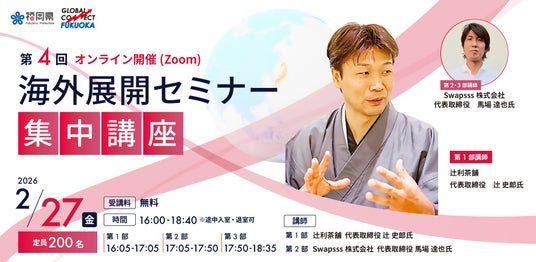また、第2部、第3部では、グローバルコネクト福岡の海外展開支援アドバイザー(欧州)であり、フランスに本社を置き、上場企業から行政機関まで、これまで延べ1,000社以上の海外展開を支援してきた実績を有する、Swapsss株式会社 代表取締役の馬場 達也氏に登壇いただき、欧州ビジネスにおける情報収集とマーケティング分析、規制関係について講演いただきます。