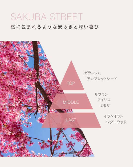 日本から海を渡り、アメリカのワシントンD.C.で毎年美しく咲き誇る桜。満開の桜は目にするたびに深い喜びを感じさせてくれます。桜に包まれたときに感じる安らぎや幸福感を表現したこの香りは、花々が咲き乱れる庭に満ちる芳香のような甘やかなフローラルノート、その奥にアンブレットシードのほんのりパウダリーなニュアンスを秘めて。ラストは春の芽吹きを感じさせるシダーウッドがふわりと温かな余韻を残します。なつかしい記憶を呼び覚ますような甘くノスタルジックな香りが、新しい季節を歩み出す日々にやさしく寄り添って。