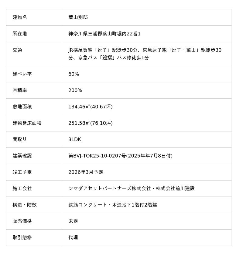 シマダグループ(本社:東京都渋谷区、代表:島田成年)が手がける、海に面したセカンドハウス「葉山別邸」が、2026年3月に完成予定です。本物件の販売は、葉山・逗子・鎌倉エリアで不動産売買仲介・賃貸仲介を行う「うみの不動産」が担当します。