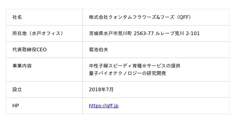 量子バイオテクノロジーを活用し「中性子線スピーディ育種(R)」を展開する株式会社クォンタムフラワーズ&フーズ(本社:茨城県水戸市、代表取締役CEO:菊池伯夫、以下「QFF」)は、2026年2月19日(木)に「株式会社LIFULL セミナールーム(東京都千代田区麹町)」で開催される「第11回事業創出ミートアップin東京」(主催:一般社団法人ナスコンバレー協議会)に、CEOの菊池が登壇することをお知らせいたします。