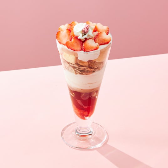 フレッシュな苺を華やかに盛り付け、ホイップクリームとスポンジを重ねることで、食べ進めるごとにショートケーキを感じられるパフェに仕上げました。桜アイスと桜あんをアクセントとして加え、春らしい味わいを表現しています。