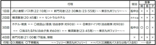 東京九州フェリー往復乗船代(基本:ツーリストA)・ホテル宿泊代(1泊)・食事代(朝1回・昼1回)・バス代(2・3日目)・入場料(東京ドイツ村)・消費税等諸税
