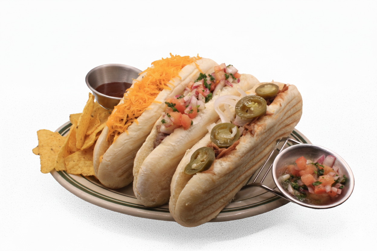 メキシカンサンドイッチ 1,100円~自家製ビーフパティグリルを挟んだオリジナルドック、メキシカンな味付けのホットサンドイッチ。(写真左から)
