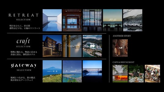 現在は、旅のスタイルと施設の個性がより伝わるよう、宿泊施設を対象とした3つのブランドカテゴリ―として「RETREAT SELECTION」「CRAFT SELECTION」「GATEWAY SELECTION」を展開。宿泊にとどまらない体験を提供する「ANOTHER STORY」や、食を通じて地域の魅力を伝える「CAFE & RESTAURANT」など、多様な切り口から旅の目的地を創出しています。
