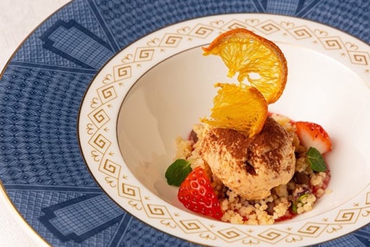 バイバイブルース東京は、シチリアパレルモに本店があります。シチリア料理をベースに月代わりのコースを提供しています。今月は、シチリア西側で食べるクスクスをデザートにしました。アーモンド・ミルク・オレンジ・チョコレートでクスクスを味付けして、シチリア特産のアーモンドは、セミフレッド(アイスクリーム)に、シチリア特産オレンジは、ほろ苦いチップスに、味わいのアクセントで、程よい酸味の鳥取県産”とっておき”苺を使用しています。
