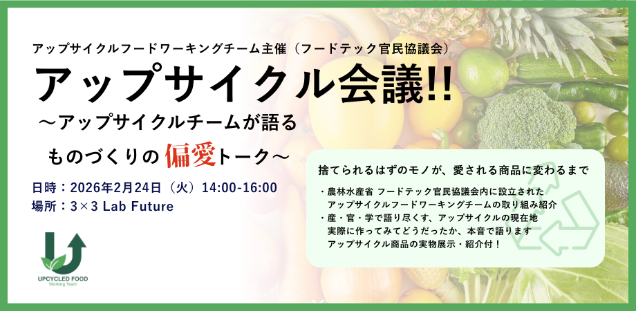 ソーシャルグッドマーケット「Kuradashi」を運営する株式会社クラダシ(本社:東京都品川区、代表取締役社長CEO:河村晃平、以下「クラダシ」)が参画するフードテック官民協議会(アップサイクルフードワーキングチーム)は、2026年2月24日(火)に東京・大手町の「3×3 Lab Future」にて、産・官・学のフロントランナーが集結するイベント「アップサイクル会議!! 」を開催いたします。