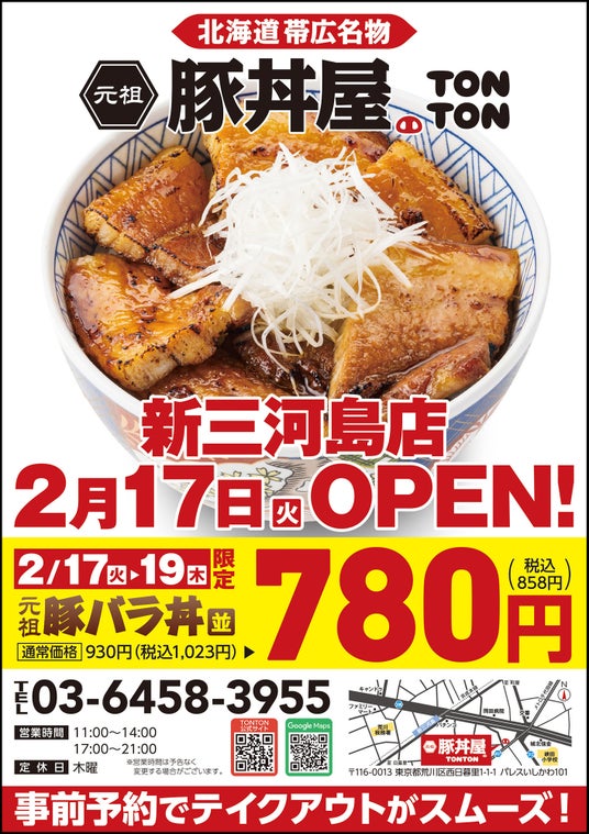 ワンズトライン株式会社(本社:大阪市北区芝田2丁目3番16号、代表取締役:山内仁)は、東京都荒川区、西日暮里エリアにオープンする「元祖豚丼屋TONTON 新三河島店」(住所:東京都荒川区西日暮里1-1-1(京成本線 新三河島駅から徒歩3分)、電話:03-6458-3955)のオープン日を、'26年2月17日(火)に決定いたしました。