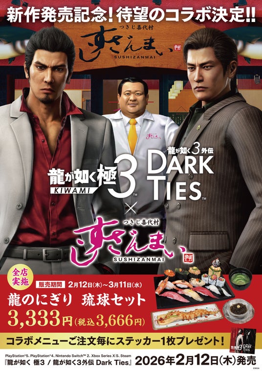 寿司チェーン店「つきじ喜代村すしざんまい」を運営する株式会社喜代村(本社:東京都中央区)は、株式会社セガのゲームソフト『龍が如く 極3 / 龍が如く3外伝 Dark Ties』の発売を記念し、2026年2月12日(木)~3月11日(水)の期間、すしざんまい全店で限定コラボメニュー「龍のにぎり 琉球セット」を販売します。