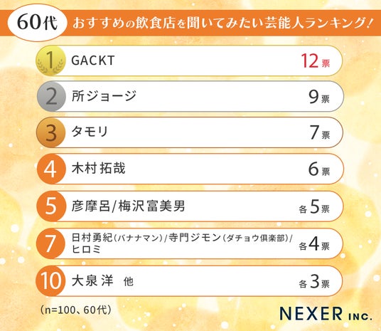 60代ではGACKTさんがトップに立ちました。