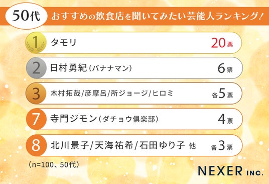 50代でもタモリさんへの支持が圧倒的で、回答者の5人に1人が選んでいます。「庶民的なお店も知っていそう」「気兼ねなく行ける店を教えてくれそう」といった声が目立ち、高級店だけでなく日常使いできる飲食店の情報を求めている層が多いことがわかります。