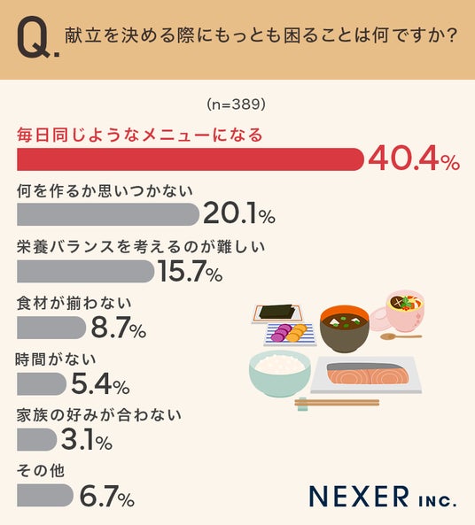 最も多かった回答は「毎日同じようなメニューになる」で40.4%でした。続いて「何を作るか思いつかない」が20.1%、「栄養バランスを考えるのが難しい」が15.7%、「食材が揃わない」が8.7%、「時間がない」が5.4%、「家族の好みが合わない」が3.1%という結果です。