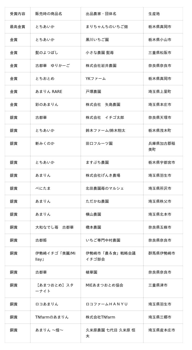 一般社団法人日本野菜ソムリエ協会(所在地:東京都渋谷区、代表理事:福井栄治)は、2026年2月4日・6日に、野菜ソムリエが選ぶ、もっともおいしい『いちご』NO.1を決定する「第4回 全国いちご選手権」(以下、本選手権)を開催しました。昨年のエントリー数375品を50品以上上回る、過去最高の『432品』が全国各地から集まり、東京・大阪の2会場で評価いたしました。評価員である野菜ソムリエが産地や品種、生産者などの情報をすべて伏せて食味。そのおいしさを審査し、もっともおいしい「いちご」を決定しました。審査の結果、「第4回全国いちご選手権」の最高金賞は栃木県真岡市『とちあいか』まりちゃんちのいちご畑に輝きました。第1回目より埼玉県が3連覇となっていた中、ついに4回目にして、いちご王国栃木県 とちあいかが日本一に輝きました。奈良県、三重県、埼玉県、兵庫県も上位受賞となりました。
