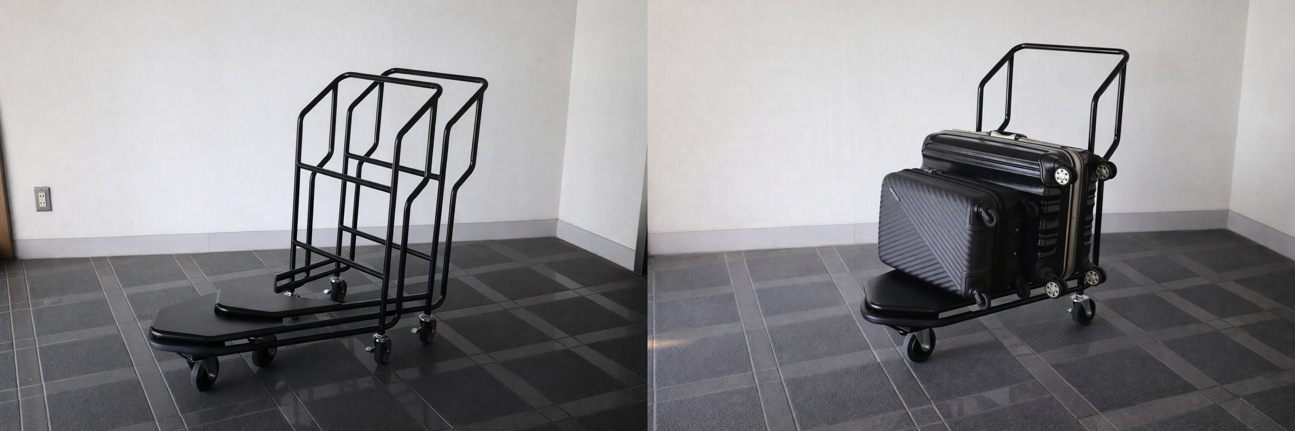 操作性とデザイン性を追求した、 2 サイズのポーターカートをご提案します。和風旅館、ホテルどちらでも違和感なくご使用いただけるよう、モダンなデザイン、カラーを採用しています。