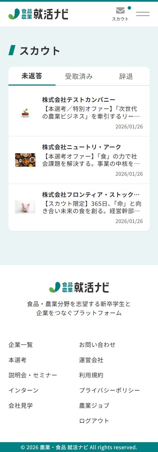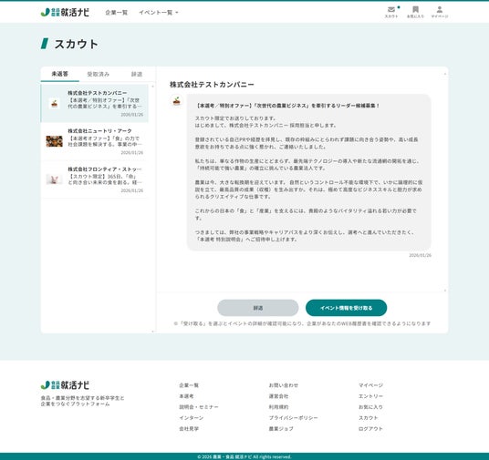 本機能は、企業が自社の採用方針や求める人物像に合った学生に能動的にオファーを送ることができる仕組みです。従来の求人掲載やイベント告知といった「待ち」の採用手法に加え、学生一人ひとりに向けて想いを届けることで、食品・農業分野における新卒採用の可能性を広げます。
