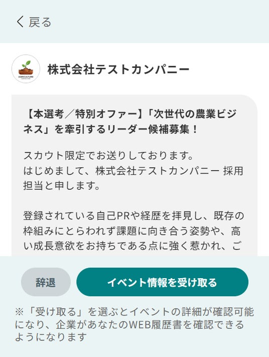 スカウト詳細画面で「受諾」または「辞退」を選択し、受諾した場合のみ、紐づけられたスカウト限定イベントの詳細を閲覧・エントリーできます。