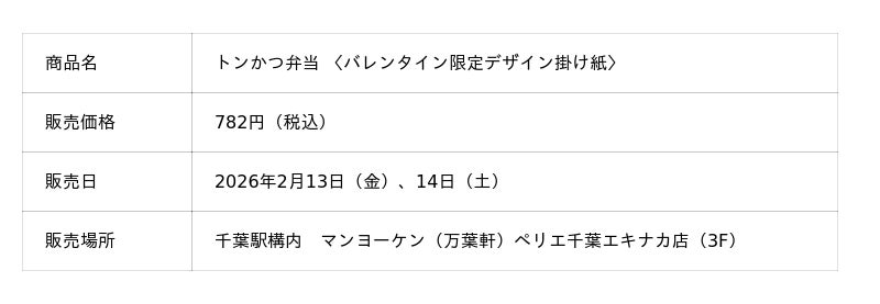 株式会社リエイグループの株式会社リエイ(本社:千葉県浦安市、代表取締役:椛澤 一)が展開する千葉県の老舗駅弁ブランド「マンヨーケン(万葉軒)」は、昭和30年代の発売より愛され続けるロングセラー駅弁「トンかつ弁当」を、バレンタインおよびホワイトデー限定デザインの掛け紙で販売いたします。